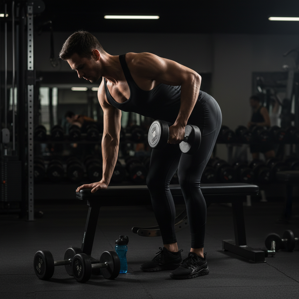 BeginnerDumbbell rows allow unilateral training to fix imbalances and provide a greater range of motion than barbell rows. The supported position reduces lower back strain while maximizing lat engagement.