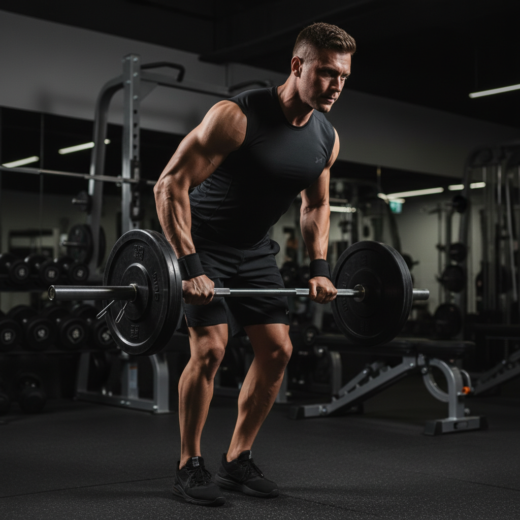 The barbell row is a heavy compound pulling exercise. Bent over at the hips with a flat back, you pull a loaded barbell from arm's length into your lower chest or upper abdomen. It builds thickness through the entire back.
