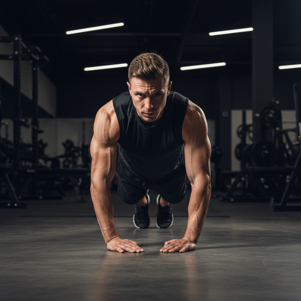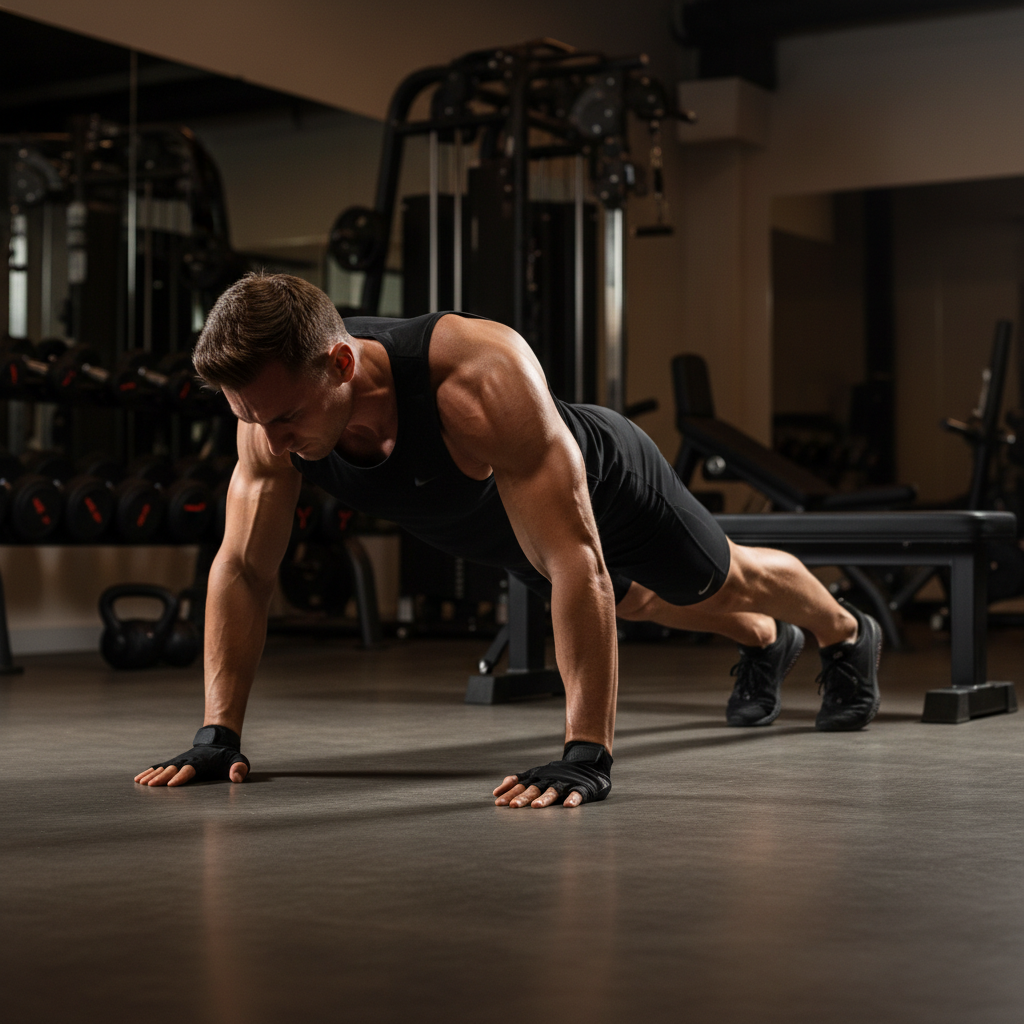 The push-up is the most accessible chest exercise. From a plank position, you lower your body until your chest nearly touches the floor, then push back up. It trains chest, triceps, and core stability simultaneously.